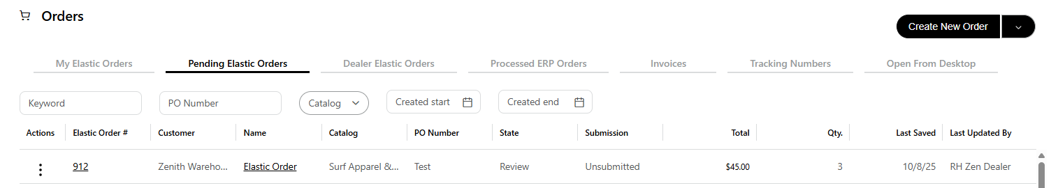 Logging into Elastic you can find any orders needing review in the Pending Orders section. This can be found from the dashboard by clicking Manage -> Orders and select the Pending Orders tab.