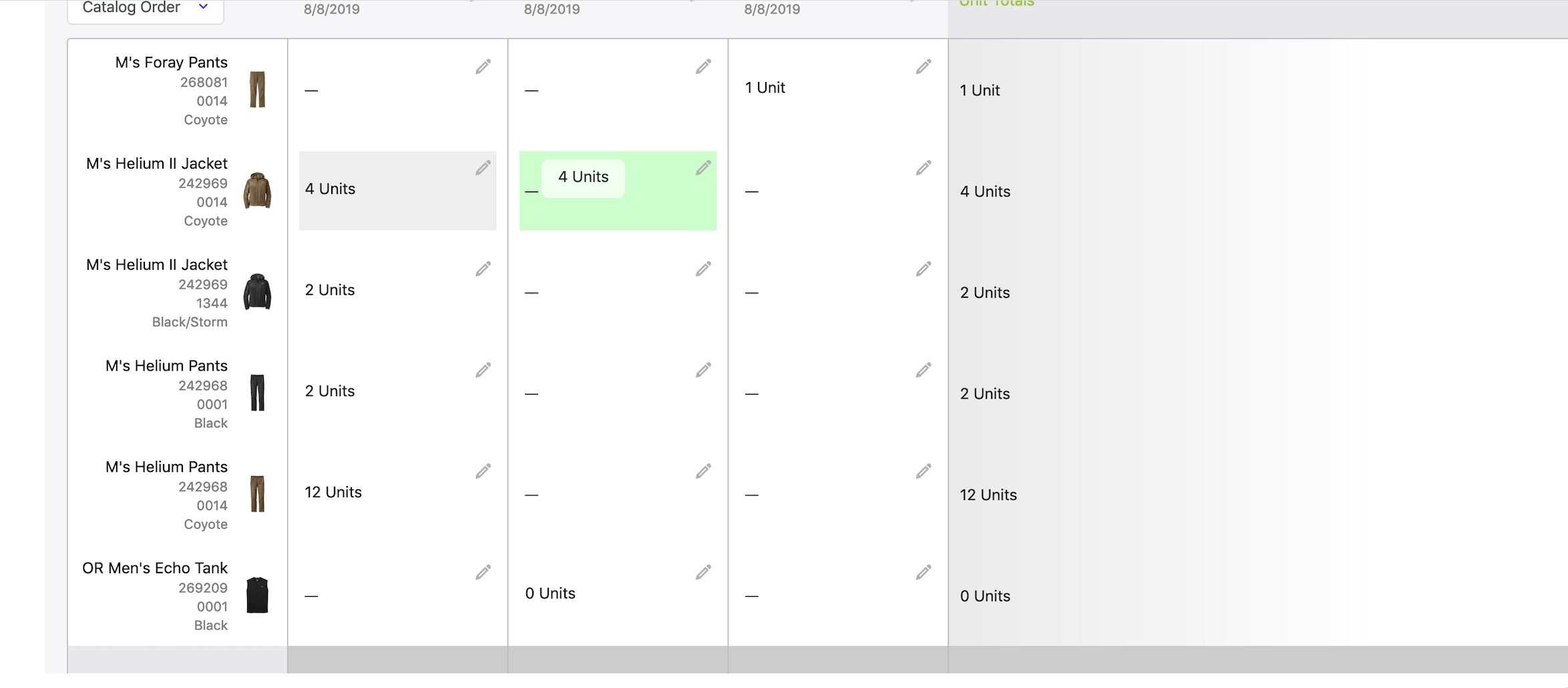 In this example you will see that this order was built with all the quantities showing in shipment 1. Maybe you need all these items but do not need them shipped until a later date. Instead of updating the amount in each shipment you can drag your amounts into any of the other columns to move them to a new shipment. Your shipment totals will update with your changes.