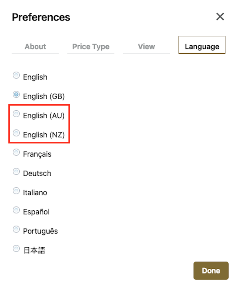 English (AU), English (NZ) added to Preferences Language Selector