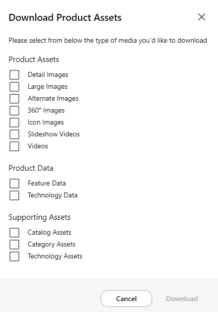 In Elastic Suite, 'Download Product Assets' is a powerful function. It allows you to create a media pack straight from your order. You are able to select from all the relevant asset data. The assets will be downloaded to your computer as a zip file. This relevant data includes: all product images, catalog assets, relevant category assets, product videos, technology assets, features data, and products data.