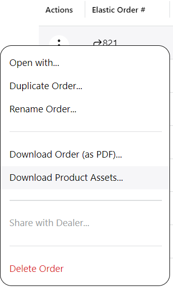 2. Select the order you want to download the assets from. The status of the order doesn't matter, as long as you have products in the cart. Click the three dots icon under 'Actions' and select 'Download Product Assets'.