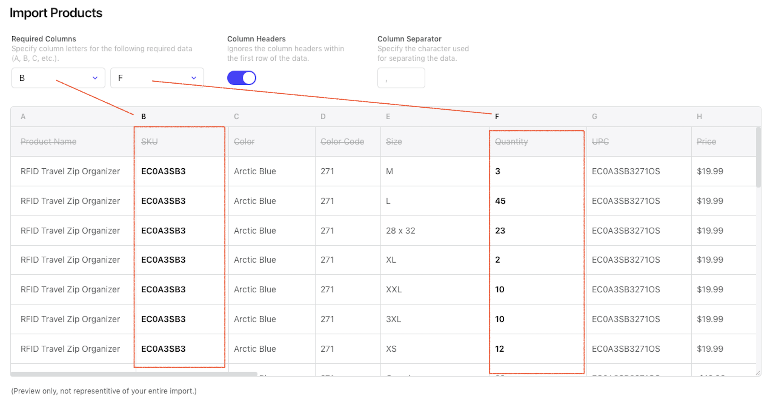 On the next page, you'll select the fields from your data that you'd like to import. Elastic looks for a valid UPC or SKU from your data and a requested quantity. For instance, in the below example my SKUs are in column B and my quantities are in Column F.