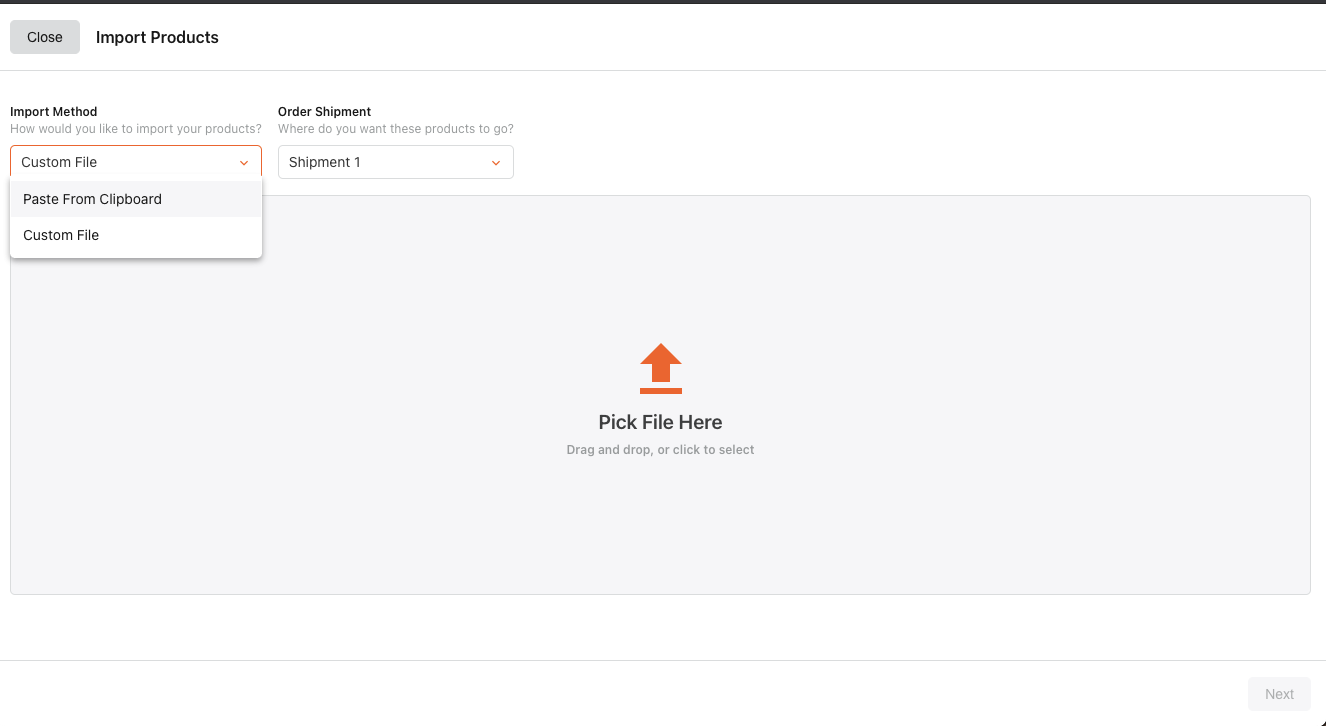 Select an Import Method. Paste from Clipboard will allow you to paste your data into Elastic. 'Custom File' will allow you to import from any file format that contains a UPC or SKU. If your brand uses a LightSpeed file, you'll see the option to select 'LightSpeed' here.