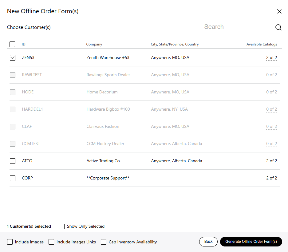5. Go to 'Next: Choose Customer(s)' and select your customers. The customers who don't have the catalog permissions for the selected catalogs will be greyed out. This page will also let you choose if you want to include images, image links, or cap the available inventory.