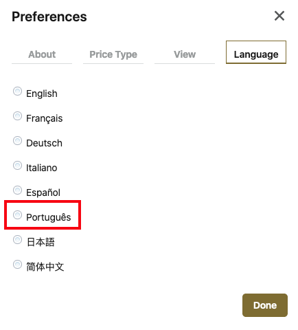 In Elastic Suite translations for Portuguese are now available through a user's Language Preferences. To change your language preference either select preferences by clicking on your name and selecting Preferences in the drop down or from the Get Started drop down, then you will find your different language options in the Language tab.
