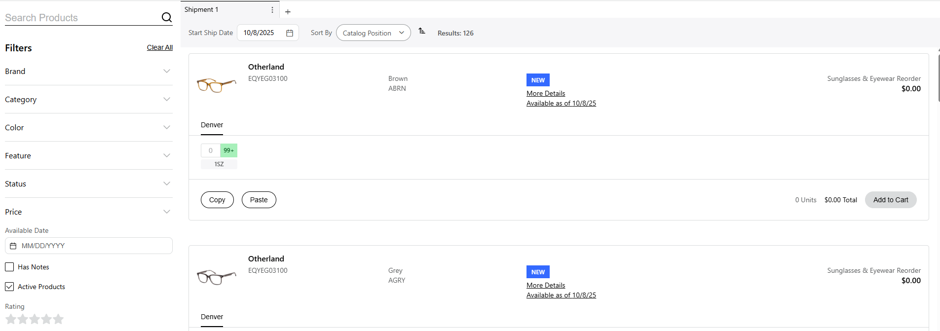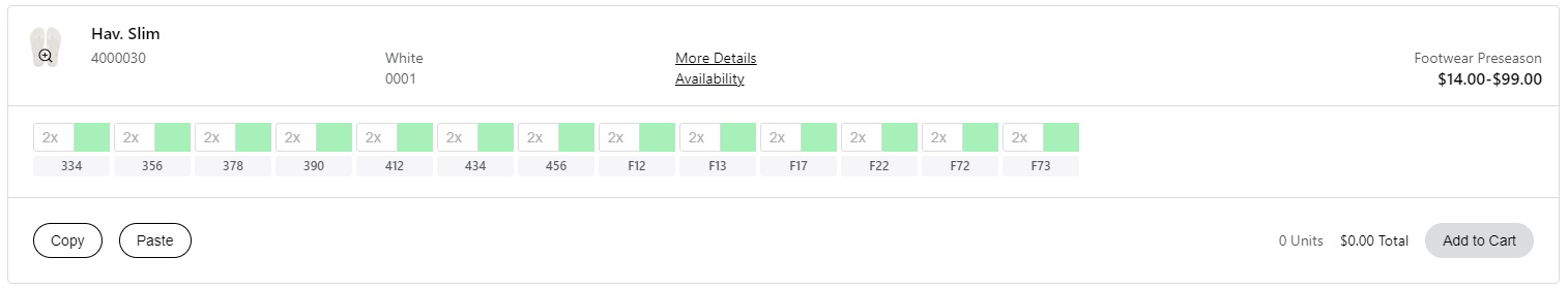 The results of your current search and filters will appear below the shipment tabs. You can easily add quantities per size by entering a number in the corresponding box. The colors in the boxes indicate the inventory levels of the product. Green indicates a large amount of stock, yellow means the inventory is getting low, and red means there is no current inventory available.